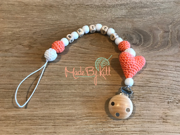 Met dit mooie speenkoord is het kwijt raken van een speen verleden tijd. Zowel de gehaakte balletjes als het gehaakte hartje kunnen in verschillende kleuren besteld worden. Omdat deze speenkoorden handgemaakt zijn en u een eigen naam kunt toevoegen krijgt u helemaal uw eigen unieke speenkoord. Mocht het koord te lang worden ivm bijv. een lange naam, dan zullen de houten balletjes tussen de letters door weggelaten worden. ( Zie de foto's als voorbeeld) Dit alles voor de veiligheid van de baby.